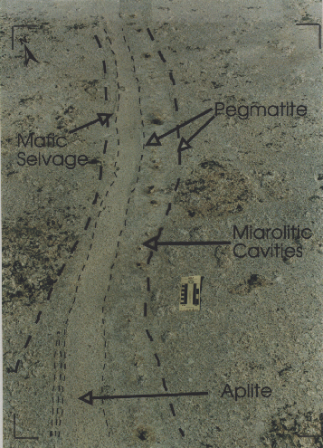 Photo 11 (adjacent to map area). Asymmetric dike which contains locally continuous bands of aplite and pegmatite. The pegmatite, present along the hanging wall of the dike, contains miarolitic cavities which are common along its length in this region.