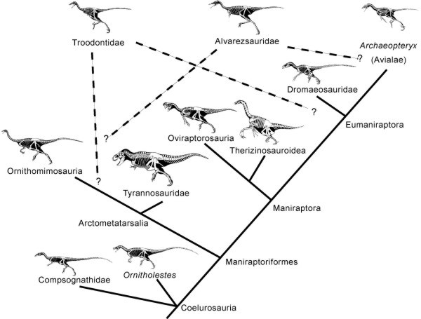 Oviraptorosauria, Dromaeosauridae ("raptors"), and Avialae (birds), but