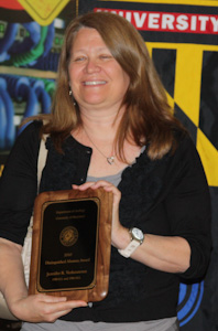 It is my privilege to present to you Jennifer Verkouteren—the 2010 Geology Distinguished Alumna. Jenny received her B.S. in 1980 and her M.S. in 1986, both in Geology, and in both cases with Jerry Weidner as her research advisor. She is an internationally recognized expert in asbestos characterization as well as in trace explosives and narcotics detection. She has published research papers on a variety of topics that range from the mineralogy of asbestos to particle analysis, from the optical properties of minerals to the chemical analysis of explosives and narcotics, and from inkjet technology to the characterization of trace forensic residues. Jenny's Masters thesis concerned phase equilibria, which led to her first job at the National Institute of Standards and Technology (NIST) as an editor for the series "Phase Diagrams for Ceramists", a compilation of important phase equilibria that forms a critical foundation in fields from materials science to geology. Subsequently, she was asked lead a program mandated by Congress to establish procedures for optical analysis of asbestos. This work led to the development of standard reference materials for asbestos and the accreditation of hundreds of laboratories for the analysis of asbestos in schools, a research collaboration with Ann Wylie, and, in 1996, the Allen V. Astin Measurement Science Award. Among other tasks in the 1990s, Jenny was also involved in the certification of the size distribution of particles in hydraulic oil as a SRM, where she was instrumental in the development of new methods for particle counting using scanning electron microscopy, for which she received a NIST Technical Achievement Award. The events of 9/11 led to a redirection of priorities in the Surface and Microanalysis Science Division at NIST. Once again Jenny assumed a leadership role, this time heading up a multi-million dollar research effort, funded by the Department of Homeland Security, to build a metrology and standards infrastructure at NIST to support national priorities in trace explosive detection. In this work, Jenny has been instrumental in the application of new microscopy techniques for the characterization of explosives particles and the development of innovative methods for sampling trace particles from surfaces, such as those associated with fingerprint residues. More recently, she has begun leading a new effort related to forensic analysis and the development of cutting-edge measurement technologies for quantitative analysis of trace levels of illicit narcotics. During this work she has been involved in developing the novel use of precision inkjet technology to prepare chemical standards for trace analysis of explosives and narcotics. Please congratulate the Geology Distinguished Alumna for 2010—Jennifer Verkouteren. (Michael Brown, Chair, Department of Geology, 2010)
