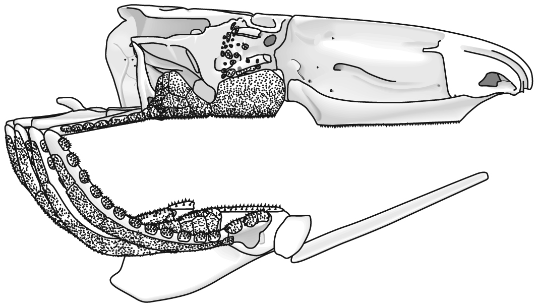 - Jaws lined with gnathals, self-sharpening occluding bony plates.