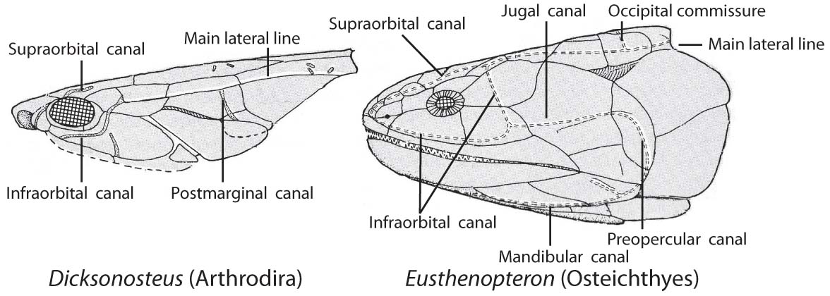 Sensory canals in an Arthrodira and Osteichthyes - Sensory canals: Present in vertebrates ancestrally, but only identifiable in vertebrates with large dermal plates. In Arthrodira we see