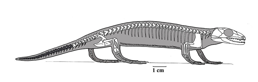 - Westlothiana: (Early Carboniferous) The earliest known unambiguous tetrapod yet surprisingly far up the amniote stem. In contrast to Solenodonsaurus a mere 10 cm in snout-vent length. Elongate with small limbs, it is reminiscent of some "microsaurs" or of many living fossorial skinks. Because it fits with notion that the first cleidoic eggs were laid by small creatures, Westlothiana was at first hyped as "the first amniote," however phylogenetic analysis didn't bear this out. Instead it emerged as the sister taxon of "Lepospondyl."(Smithson et al., 2011) Without this anchor, its position is unclear.