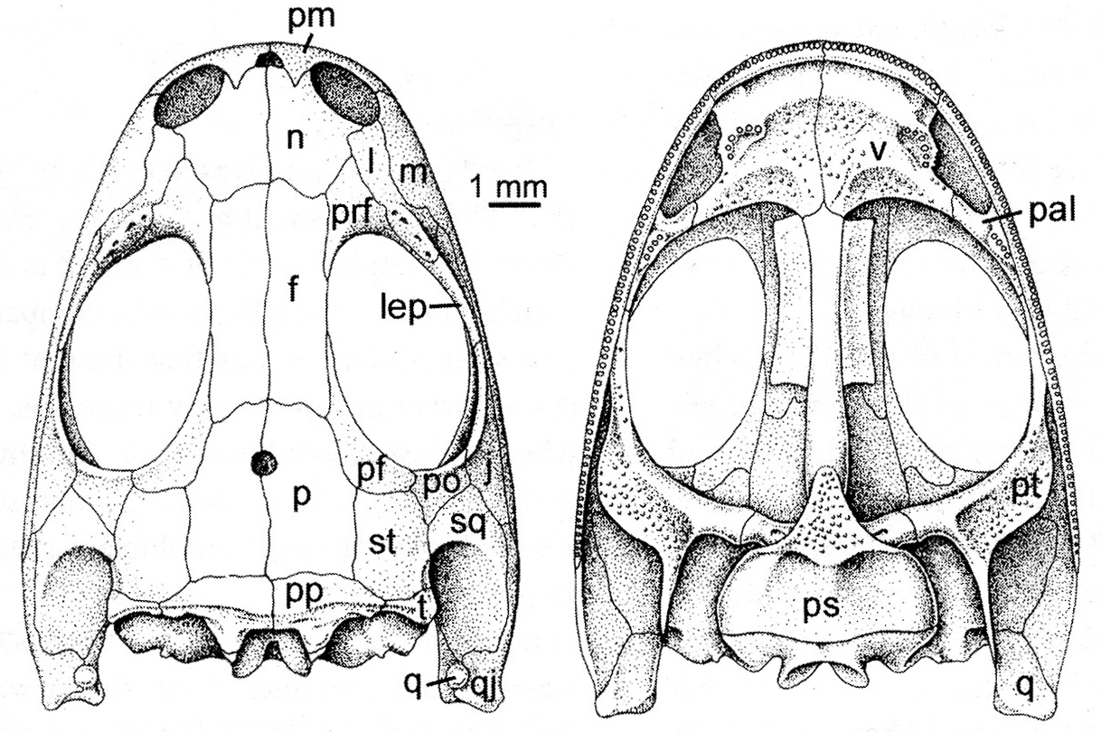 Most fossil frogs share these features (although some have more dorsal vertebrae). Our earliest glimpse is from Triadobatrachus from the Early Triassic. Although plesiomorphic in many ways, and probably unable to jump, it shows the initial stages of many froggie adaptations of the cranium and postcranium.