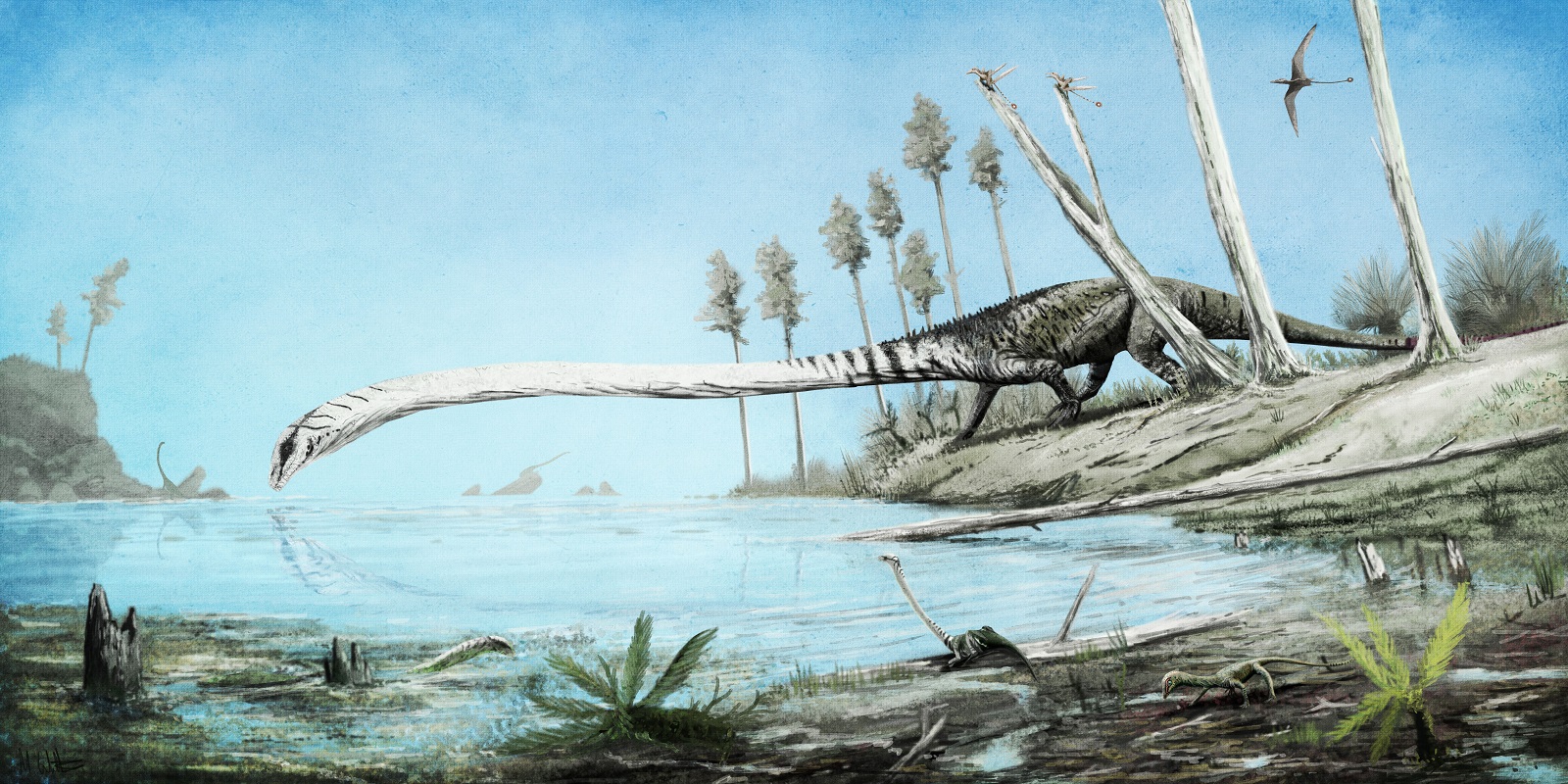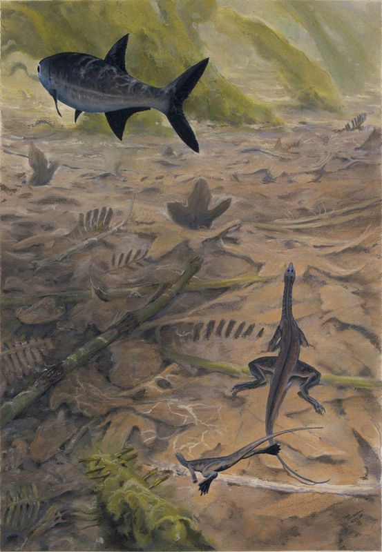 (Latest Early Triassic - Late Triassic.) An independent derivation of the long-necked extreme.- Earlier members like Macrocnemus were at most facultatively aquatic, and shows limb proportions similar to cursorial squamates, just with a longer neck. Even so, its remains are found in shallow marine environments, suggesting that it at least lived near water.