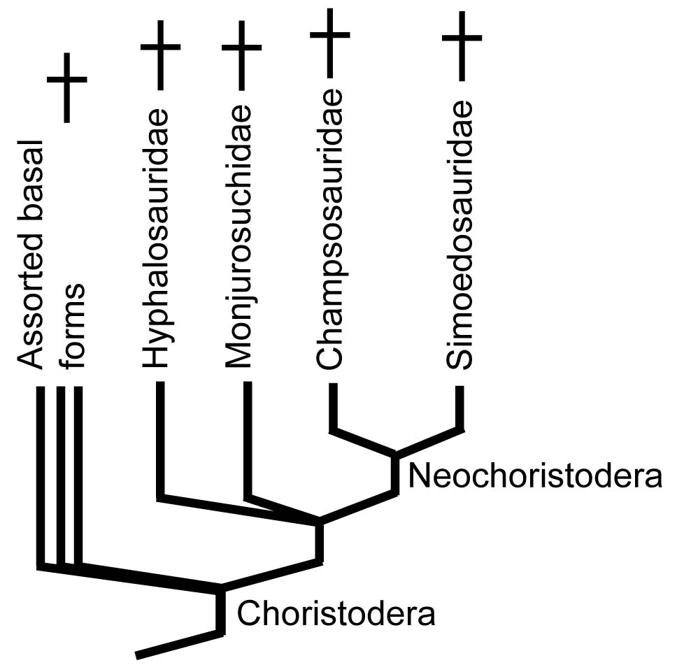 (Late Triassic - Neogene) Before we start, an intractable phylogenetic headache: Members of Choristodera - a well-diagnosed group - has been found to be: