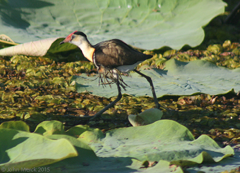 Comb-crested jacana Irediparra gallinacea carrying chicksLocation: Yellow Water Billabong, Kakadu National Park, NT, Australia Year: 2015 Merckslides catalogue number: 04-88548 Comments: Captive |
