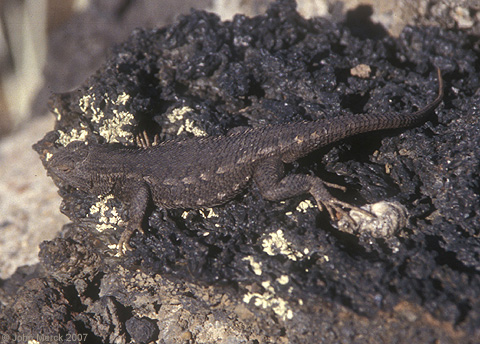 Eastern fence lizard Sceloporus undulatusLocation: Sunset Crater National Monument, near Flagstaff, AZ Year: 2007 Merckslides catalogue number: 04-23869 Comments: A local, lava-flow adapted dark morph. Note that the eruption that created the flow occurred in 1065, so this color change represents only 1000 years of evolution. |