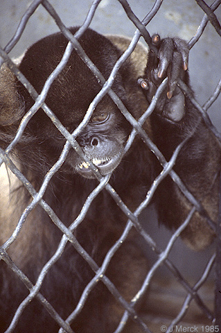 Woolly monkeyLocation: San Antonio Zoo - San Antonio, TX Year: 1985 Merckslides catalogue number: 04-16075 Comments: In 1985, I visited the zoo on two consecutive days. On both, this poor creature was leaning listlessly against the wire of its cage in exactly the same position. |
