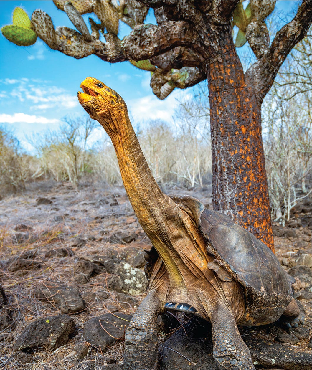 islands have evolved taller woody trunks, and in response the tortoises have evolved a "saddle-backed" shell that allows them to