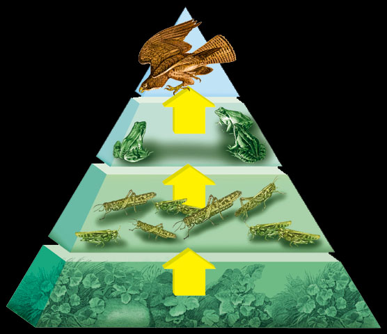 As you move up a food chain, there is less and less energy available. Plants receive much (but by no means all) of the energy of incoming sunlight; some of that energy becomes stored as their tissues, but the rest of it is used for them to run their bodies. Herbivores consume plants, and gain some (but not all) of that stored energy, some of which they used to build their own tissues but the majority being used for their own operation (running, breathing, pumping blood, etc., etc., etc.). Predators eat the herbivores, gaining some (but not all) the stored energy in the tissues of the herbivores, using some to build their own bodies, but the rest for their operations. Thus, the amount of energy available at each trophic level becomes less and less: this is described as the energy pyramid.
